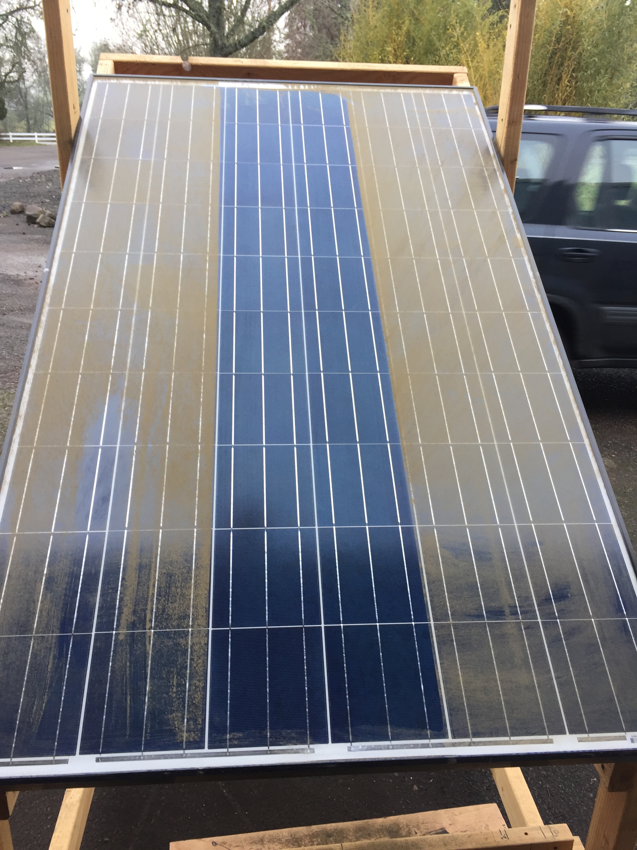 Demonstration of Pellucere’s MoreSun® anti-reflective coating with Talus DRT as dust and dirt is being blown over a module coated on both edges with MoreSun® and not being coated down the middle. The results show that MoreSun® with Talus DRT does not allow the dust and dirt to adhere to the module.